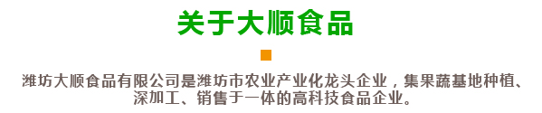 濰坊大順食品有限公司創(chuàng)建于2006年10月,位于中國出口蔬菜基地安丘市。地理位置優(yōu)越,距離青島港100公里,是濰坊市農(nóng)業(yè)產(chǎn)業(yè)化龍頭企業(yè),2022年被授予國家級(jí)高新技術(shù)企業(yè),2024年被授予省“專精特新中小企業(yè)”。公司通過了歐盟BRC質(zhì)量體系認(rèn)證,ISO9000認(rèn)證,清真HALAL認(rèn)證。公司占地面積26680㎡,員工190人,主要制造、銷售VF果蔬脆片、FD凍干果蔬、香菇素牛肉、黑蒜等產(chǎn)品,年產(chǎn)能6000噸,創(chuàng)匯1000萬美元!